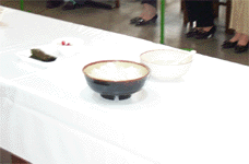表彰式が終わったところで、熱いきのこ汁と漬け物がテーブルの上