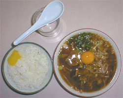 付き)、生卵が落とされた中華そば(つゆ少々こぼれる)を置いてくれ