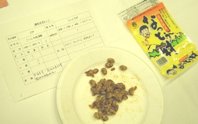 Q.審査のポイント、最近の納豆の動向は?A.審査のポイントは3つ。食感、納豆菌の繁殖の具合、糸引き、香り。(回答 黒田様)最近の納豆の動向としては、臭い抑えめで糸引きの弱いもの、コストの安いもの、それと対極に位置するこだわりの納豆です。(回答 野呂様)おっと、質問「魔」の私としてはここで質問しなければなりません。三井田:スイマセーン、2点質問があります。審査風景を拝見させていただいて、発酵過程で一般的な発泡スチロール容器、カップ、経木、藁を使ったものが分かったのですが、経木の香りがあった場合の評価はどうなるのでしょうか。2点目の質問は、評価の基準なんですが、最近は安いから買うという方が増えております。価格と味のバランスという面での審査を今後行う予定はあるのでしょうか。ご回答:経木の香りが評価の裁定に入るかということですが、総合的に製品として評価しますので、結果的に良い香りに仕上がっていれば評価の対象となります。また、値段を考慮しての評価を行う予定はありません。(回答 野呂様)直接の回答になるかどうか分かりませんが、先日消費者にリサーチをかけたところ、値段が安いから買うという人より、健康に良いから買うという人が増えてきていること分かりました。 (回答 リサーチ会社 IMPさん)ようし、調子に乗って、さらに質問です。三井田:今回、黒豆の出品はないように感じましたが、粒割りや黒豆の出品があった場合、それらに対する色の評価等は通常の大豆と異なると思いますが、どのように評価しますか。ご回答:評価を細分化していく案はでているが、実際には評価者の食べる量の問題もあり難しいので、それ単体でよく出来ているかできていないかで評価する。 (回答 野呂様)もういっちょ、配布された資料について質問。三井田:消費者に対するリサーチ資料のなかに、納豆購入時重視点として、1.日付の新しいもの 69.3%2.価格 66.3%3.納豆の種類(大粒/小粒など) 57.6%となっておりますが、家でゴロゴロしているオトーサンが「あらヤダ、(手首のスナップ効かせ)この納豆安いわぁ〜」(会場の一部で寒い笑い)と言って買うとは思えません。男女別の集計結果はございませんでしょうか。ご回答:男女別、都道府県別に集計した資料がございますので、お名刺を頂ければお送りいたします。(回答 リサーチ会社 IMPさん)配布された全国納豆協同組合連合会PR委員さんと納豆インフォメーションセンター(IMPさんに委託)による「納豆に関する全国消費者調査<サマリーレポート>」という2141名を対象に行ったインターネットでのリサーチ(今年1月18日〜25日)の結果ですが、なかなか興味深いものもあり、例えば「試したい納豆調理方法」なんてものもあり、1.納豆餃子 20.3%2.天ぷら、フライなどの揚げ物 19.2%3.マグロ納豆 17.9%という結果でした。マスコミ説明会が終わり、3時間経過。同点決勝による三次審査もあったとのことで、かなり遅れ気味の結果発表となりました。その結果は、以下です。最優秀賞 農林水産大臣賞「なっとう村」栃木県・こいしや食品優秀賞 農林水産省総合食料局長賞「国産大豆100%納豆」宮城県・わたり納豆農林水産省総合食料局長賞「道産納豆」北海道・道南平塚食品