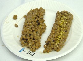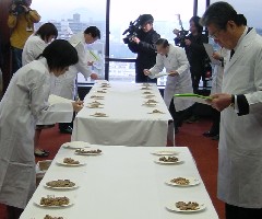 平成14年2月22日(金)、宮城県仙台市にありますJAビル宮城(宮城県仙台市青葉区上杉1−2−16)にて、納豆に日本一を決定する「第7回全国納豆鑑評会」が行われました。今回は、全国納豆協同連合組合連合会の会員の40%にあたる124社から一企業一部門のみ出品で、極小・小粒部門(6.5mm未満)ひきわり納豆も同部門中粒・大粒部門(6.5mm以上)の2部門での審査です。。面白いことに、毎年出品は小粒、大粒ほぼ半分ずつだそうです。審査員は26名。失礼ながら敬称を略し、役職名で列挙させて頂きます。・高星進一 全国納豆協同連合組合連合会会長・同 副会長・同 常務理事・同 相談役・須見洋行 倉敷芸術科学大学産業科学技術学部教授・永山久夫 食文化研究所・茨城県工業技術センター主任研究員・宮城県地域婦人団体連絡協議会会長・宮城県PTA連合会会長・納親会会長・宮城県消費生活センター技術次長・宮城県学校給食会理事長・青森県納豆組合理事長・岩手県納豆組合理事長・宮城県納豆組合理事長・秋田県納豆組合理事長・山形県納豆組合理事長・福島県納豆組合代表理事長・武陽食品株式会社東北第一営業所所長 常務取締役・三倉産業株式会社部長・全国農業協同組合連合会農産部大豆販売課職員・東北農政局 企画調整部 部長・宮城県産業経済部長・宮城県農業協同組合中央会 会長・農林水産省総合食料局食品産業振興課 課長補佐・厚生労働省医薬局食品保健部企画課 課長補佐一次審査は、審査員が大粒組と小粒組に分かれ、8:30より始まりました。