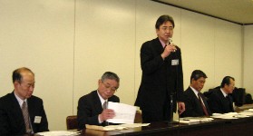 「あっ、金粉・・・・」『メーカー名が分からないように』と記述してしまいましたが、明らかに菊水食品さんの「Gold in Nattou」と分かってしまったような気もします。第一次審査が終わったところで、マスコミへの説明会となりました。全国納豆協同連合組合連合会PR委員長の岡崎様、「納豆市場は113.4%の個数の伸びがある。全国納豆鑑評会はPR目的もあるが、品質の向上も目的である。来年は長野で開催予定」「この不況の時代のなかで納豆が伸びているのは、納豆の本当の良さを分かってくれている人が増えているから」とのご挨拶ののち、質疑応答となりました。