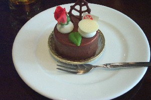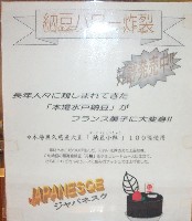 平成13年3月10日、文字通り吐くほど納豆を食べた「第1回納豆早食い世界大会」の会場を後にした、橋本さんと私はひたちなか市にある「デザート工房」(茨城県ひたちなか市表町4番11号 電話029-272-2033)に向かいました。「デザート工房」さんでは、納豆の入ったケーキが普通に売られているとのことで、橋本さんには無理を言っておつき合い頂きました。早速、「デザート工房」さんに入りますと、あっ、ありました。納豆ケーキ、その名も「ジャポネスク 300円」。チョコレートにコーティングされた直径4cmほどのケーキで、上には「くめ納豆」シール、バラ、チョコレートで作った葉や枝が飾られています。