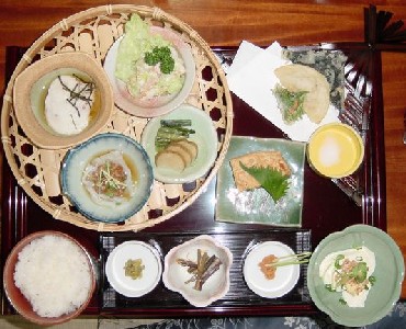平成14年4月のリニューアルに伴い、地元の納豆メーカー・大力納豆さんの納豆を使った納豆料理をだすことになったという関越自動車道小出IC出口近くの「かたっくり」さん、小出町総合ビジターセンター「かたっくり」北魚沼郡小出町大字千溝2088−1電話02579-2-9222FAX 02579-2-8550に平成14年4月12日、行ってまいりました。納豆料理について意見を聞かせてほしいとのことで、私のような者で良いのかと思いつつ、僭越ながら伺った次第です。大力納豆料理は、大力納豆御膳 1200円大力納豆カレー 680円冷やし納豆そば 600円冷やし納豆うどん 600円大力納豆サラダ 480円とあり、今回は「大力納豆御膳」を頂くことにしました。料理を食べる前に支配人さんにご挨拶しましたが、リニューアルでお疲れになっているご様子ながらも、やる気が感じられましたので私としてもしっかりとガチンコでお答えしなければなりません。一緒にお邪魔したNHK新潟の皆さん、大力納豆の坂詰さんと雑談しているうちに「大力納豆御膳」到着。