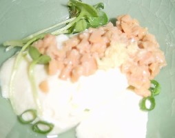 これはダシ汁の具合といい、素晴らしい一品です。ただ納豆のネバリ好きの方のためには、ダシ汁は別でお出しした方が宜しいかと思います。・山かけ納豆大粒納豆におろした芋をかけ、海苔、ダシ汁をはったもの。