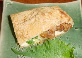まろやかな豆腐に納豆の旨みが光る一品ですが、茗荷などの薬味による味のシメも多少ほしいところです。また、コスト的に合わないかも知れませんが、大力納豆さんの辛味納豆をのせるということも「あり」ではないでしょうか。・納豆天ぷら海苔、ワンタン、しそで納豆を包んだ三種天ぷら。