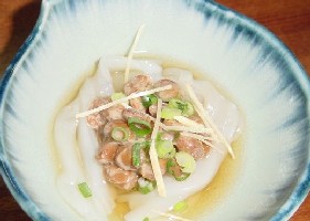 居酒屋などでの定番ですが、実はこの料理には弱点があります。醤油をかけて食べる場合が多いのですが、油揚げは醤油をはじくので、口中で「油揚げは油揚げ」「醤油は醤油」という状態になることがあると思います。他の油揚げ納豆との差別化にこんな案はいかがでしょうか。改善案1 醤油を塗ってから焼く。改善案2 いしる、しょっつる等の魚醤を塗ってから焼く。・イカ納豆大粒納豆にイカを混ぜ、細切り生姜、ネギをのせ、ダシ汁をかけたもの