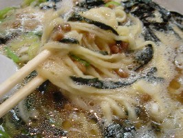 納豆ラーメンの食券をおじさんに渡すと、「はぃ〜い、納豆いっちょぉぉぉ〜」と咆吼したかと思うと、おもむろに銀色のアルミボールに納豆を1パックあけ、そこへ生卵を投入。あとは、おじさんがガムシャラにかき混ぜます。納豆をかき混ぜ終わったところで、別の人が作っていたラーメンの上に流し込み、海苔をかけてできあがり。約4分でできました。少し太目の縮れ麺が、脂膜をうっすらと張ったスープに沈み、ほうれん草、泡立った卵混ぜ納豆、そして海苔がかかっています。まずはスープを一口。魚介系の臭いがするものの、脂っこく化学調味料が多いようです。手打ちらしい、太くザク切りした麺は、縮れたビロビロ感が楽しいのですが、麺の茹でたお湯のヌメリ感がかなりあり、あまり好みではありません。