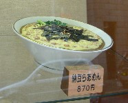 実際に麺を茹でる釜を見ますと、すでにデロデロのお湯でそこに水を常時足しながら、麺を茹でています。つけ麺ですと、麺をあげてから一度洗うので、問題はないと思いますが、ラーメンの場合はかなり気合いをいれて湯切りしないと、茹汁のヌメりが残ります。納豆は、小粒の大手メーカのものらしく、アンモニア臭もキツかったので、購入後時間が経ったものか、常温で保存したと思います。・・・・・失敗したかも。スープを全部飲まないと納豆が食べられない(コーン・ラーメンと同様)ので、スープを全部飲み、早々に立ち去りました。