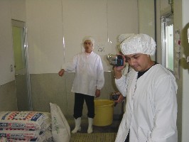 今回参加された皆さん全員が、納豆工場は初めてということで、おもちゃのショーウィンドウを覗く子供のように、目を輝かせていらっしゃいます。いよいよ白衣、長靴、頭にネットかぶって、工場内部の見学に入ります。工場に入る際には、粘着テープ(通称:コロコロ)で体についているホコリをとり、アルコール消毒液を手につけ、消毒液のプールを長靴でジャバジャバと横切って入ります。アルコール消毒液が噴出しないと工場のドアが開かないインターロックが組まれており、衛生面への配慮を感じます。納豆製造の工程は、1.選 別 大きさの異なるもの、割れたものなどを選別し、均一な大豆にします。