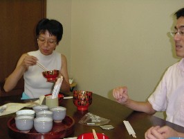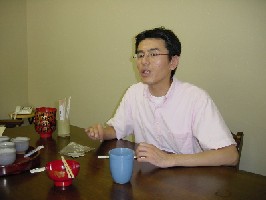 オール木造で造られた室は、電気で加熱するのではなく、その中央に置かれた七輪の炭火のみでじっくり加熱され、断熱材である「もみがら」がしっかりと保温します。湿分は、七輪の上に置かれたヤカンからの湯気で供給するという、懐かしいスタイルです。この懐かしいスタイルが実は非常に重要で、ヤカンの口を決まった方向に向けてセットすることで、強制循環のラインができ、室の温度が均一化するというメリットがあります。「南都さん、さすがですね〜」「いやぁ、オヤジが考えたんですけどねぇ」・・・・正直な方でございます。また、下仁田納豆さんは、納豆の容器に経木を使用しているので、それもうまく作用し、発酵の具合も宜しいようです。工場をでて、南都社長からお話を聞こうとテーブルにつこうとしたとき、意外な事が分かりました・・・・アメリカ人のダニーさん、納豆を食べたことがないそうです。「ようし、南都さん、やりますか?」「やりましょう!」となぜか盛り上がり、大袖振納豆を持ってきて、まずはダニーさんに匂いを嗅いでもらいます。