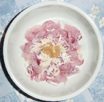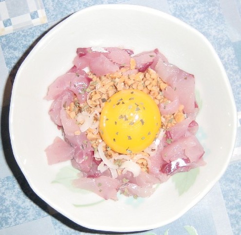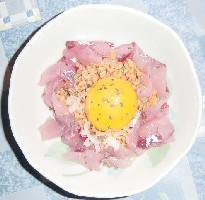 早速、サバきます。 ずっしりと肉感があり、死後硬直で背筋(?)の伸びた鰺 の内臓を掻き出すと、卵やら子やら入っており、旬であるこ とを十分に教えてくれます。 まずは、鰺の刺身。今回包丁が両刃なので、プロの板前の ような切り口にはなりませんが、新鮮な鰺ゆえ、表面が光り ます。 続いて、鰺のタタキ。刻みネギ、おろしショウガをのせました。 そして、いよいよ鰺タタキ納豆です。 納豆は、大力納豆さん(http://ww5.et.tiki.ne.jp/~dairiki/) の「ひきわり納豆」を使用しました。 良くかき混ぜた納豆のまわりに、刻みネギ、鰺のタタキを置き、卵黄を 中央に落として完成!飾りには、冷凍乾燥させたパセリをパラ パラ。 醤油は、自家製納豆味噌のたまりです。
