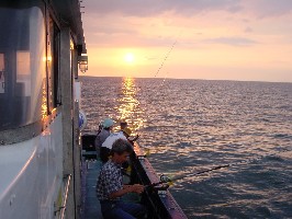 日本海の夕日を浴びながら、5km沖に到着したところで、 早速仕掛けをおろします。 ![]() 35mまで仕掛けを落とし、「しゃくり」と呼ばれる技法で 竿を上下させ、鰺を疑似餌に誘うわけですが、いきなり雲行きが 怪しくなってきました。 ![]() 「まずいなぁ」と思った矢先、「ガガーン」という大きな雷 鳴とともに、大粒の雨。 ![]() あまりのワガママさに耐えきれなくなってお別れした女性で したが、釣りたての鰺を食べさせると約束した以上は、釣って いかなければなりません。 まるで『竹取物語』で、かぐや姫をめぐって危険な旅にでる 5名(石作の皇子、車持の皇子、左大臣阿倍のむらじ、大納言 大伴の御幸、中納言石上の麻呂)の気分です。